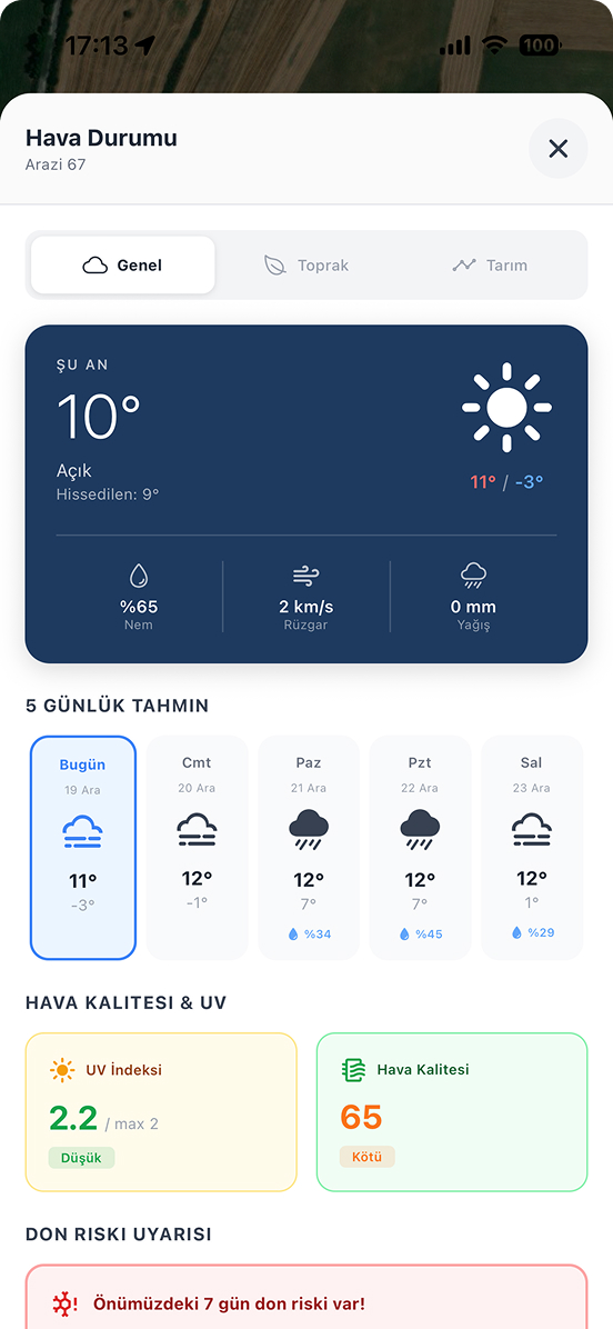 Arazinize özel, profesyonel ve detaylı hava durumu tahminleri. Günlük ve saatlik tahminler, yağış olasılığı, rüzgar hızı ve daha fazlası ile tarımsal operasyonlarınızı planlayın.